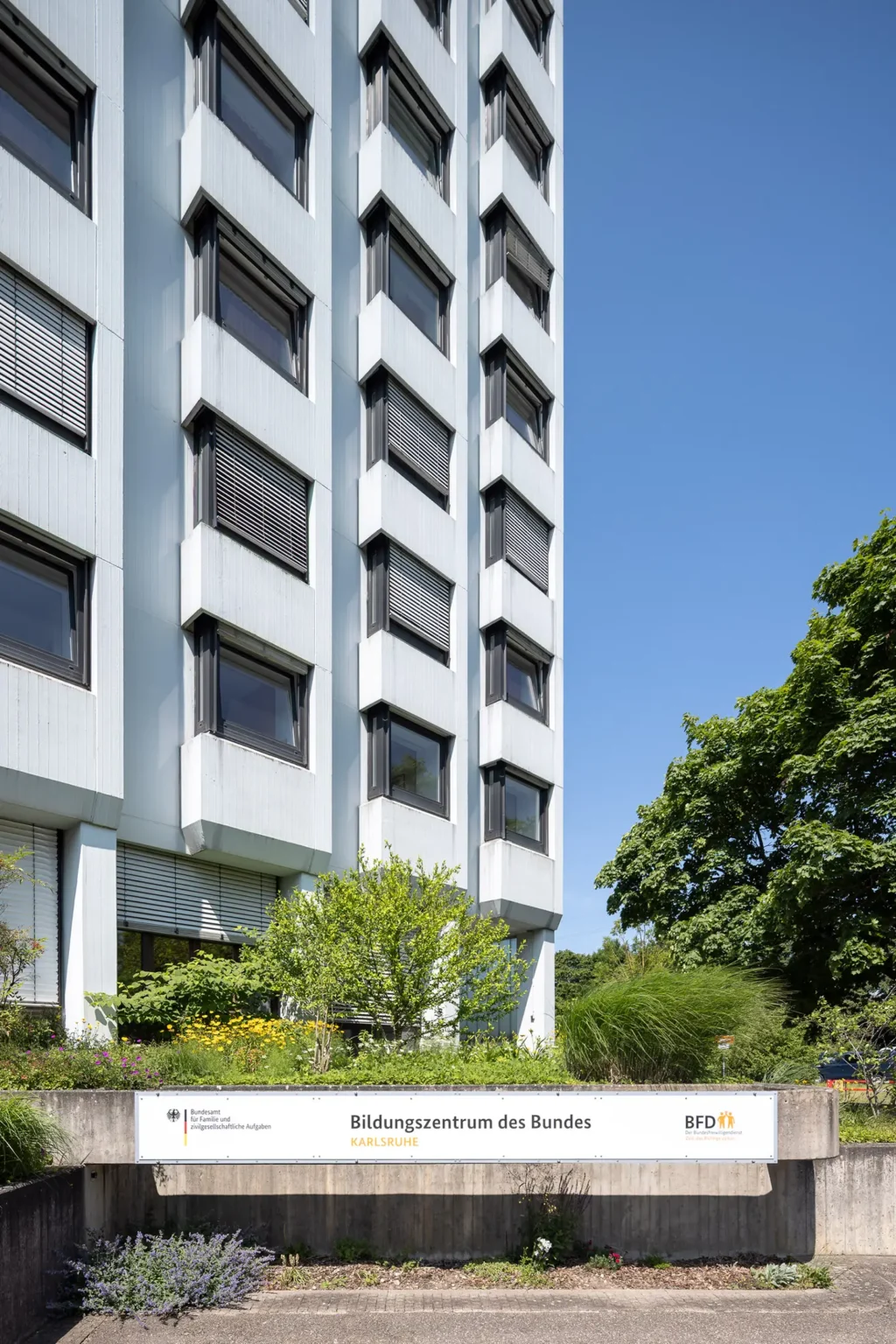 Die Immobilie, in der sich das Bildungszentrum Karlsruhe befindet, liegt in der Nähe des Karlsruher Hauptbahnhofs und wird von der Karlsruher Fächer GmbH im Auftrag der Stadt verwaltet und betreut. Das Zentrum wurde vom Bundesamt für Familie und zivilgesellschaftliche Aufgaben für den Bundesfreiwilligendienst angemietet und hat rund 25.000 Übernachtungen im Jahr. Im Gebäude befinden sich unter anderem Seminar- und Schulungsräume, Aufenthalts- und Freizeiträume sowie eine Großküche und ein Speisesaal, um die „Bufdis“, die sich hier zum Teil mehrere Wochen lang aufhalten, mehrmals am Tag mit frischem Essen zu versorgen.